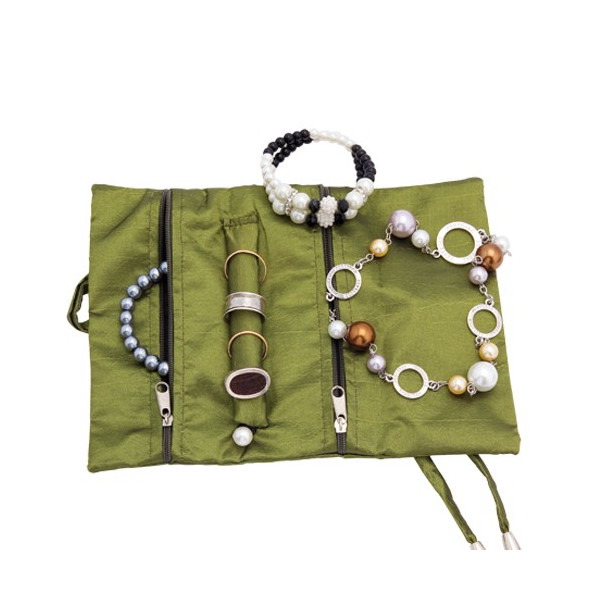 Joyero plegable en suave poliéster de sobrios colores. Con soporte para anillos y dos bolsillos de cremallera a juego. Cierre con cintas rematado con accesorios en color plateado.