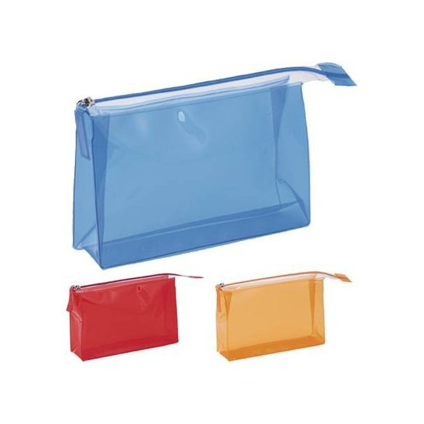 Neceser (nécessaire) multiusos en resistente PVC transparente con cierre de cremallera y asa de transporte a juego.
