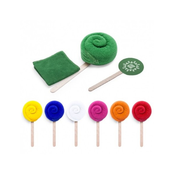 Divertida toalla piruleta en absorbente y suave microfibra de 260g/m2 en vivos colores.