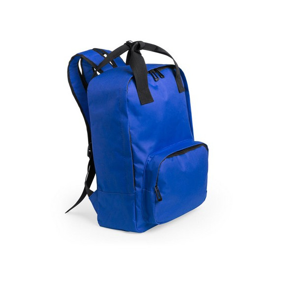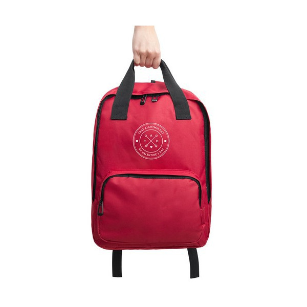 Resistente mochila de poliéster 600D con cierre de cremallera, bolsillos frontales y originales asas reforzadas. En variados colores, con espalda y cintas de hombros acolchadas, compartimento acolchado interior para portátil de hasta 15 pulgadas y resistentes tiradores en color negro.