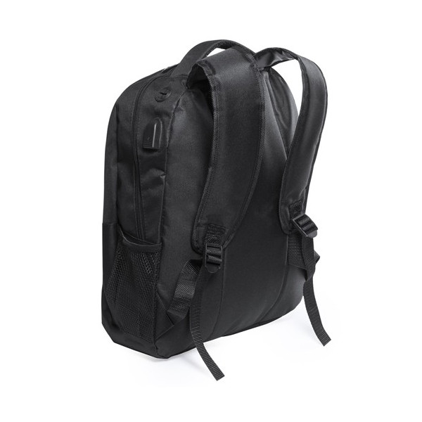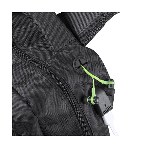 Mochila de resistente poliéster 600D en elegante acabado impermeable de color negro y salida para auriculares. Con compartimento interior con salida USB para conexión de powerbank -no incluido-. Interior con compartimento acolchado para ordenador portátil de hasta 15 pulgadas y tablets de hasta 10 pulgadas. Multitud de bolsillos interiores y exteriores. Cintas de hombros y espalda con acolchado ergonómico.