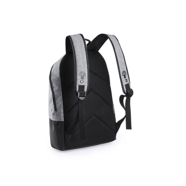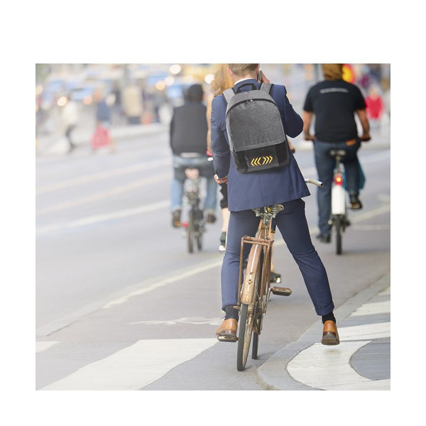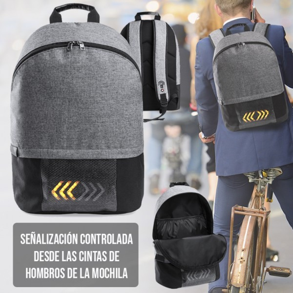 Mochila con indicadores, en resistente poliéster 600D. Indicadores luminosos en la base, con señalización controlada desde las cintas de hombros de la mochila. Bolsillo principal con doble tirador e interior con bolsillo acolchado para ordenador portátil de hasta 15 pulgadas. Espalda y cintas acolchadas. Conexión micro USB -cable incluido-. Requiere de un powerbank -no incluido- para el funcionamiento de las luces.