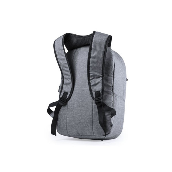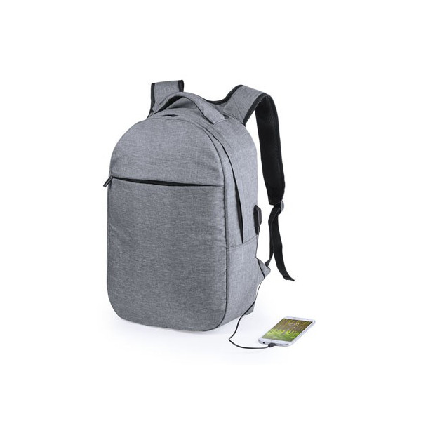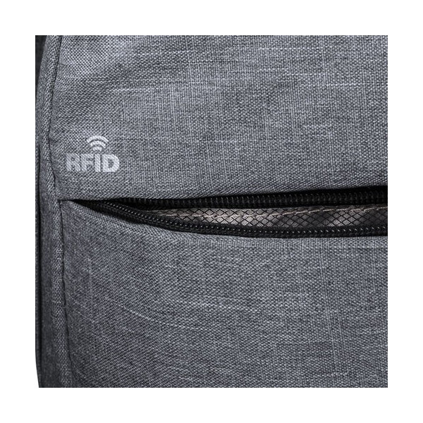 Mochila de seguridad, con diseño urbano en resistente poliéster 300D. Bolsillo interior con protección de seguridad RFID (Identificación por Radio Frecuencia) que mantiene seguros los datos de la tarjeta y demás dispositivos. Compartimento principal con elegante tapeta en la cremallera. Con conexión USB -powerbank no incluido- y bolsillo interior acolchado para ordenador portátil de hasta 15 pulgadas. Parte trasera y cintas acolchadas.