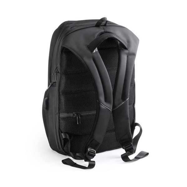 Elegante mochila de negocios resistente al agua en nylon de alta calidad. Con compartimento interior con salida USB para conexión de powerbank -no incluido-, incluye cable micro USB de 1 metro de largo para total comodidad en la carga de cualquier dispositivo móvil. Con compartimento interior acolchado para ordenador portátil de hasta 15 pulgadas y multitud de bolsillos interiores y exteriores. Cintas de hombros y espalda con acolchado ergonómico.