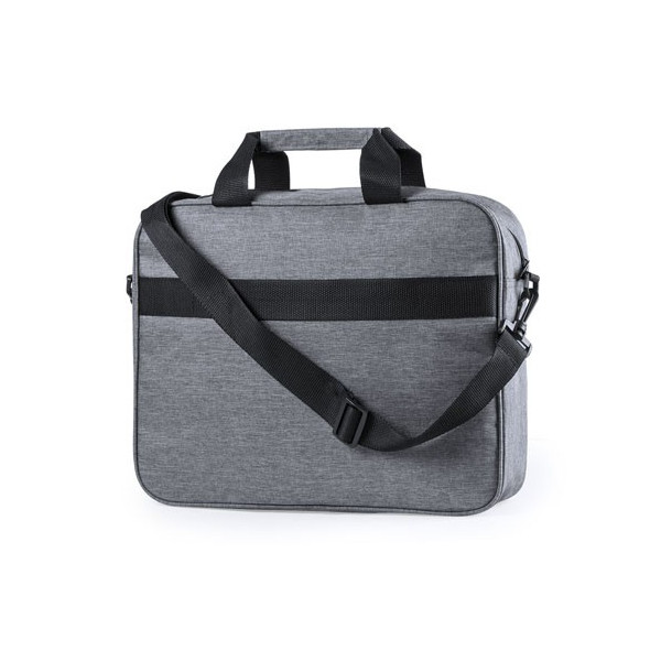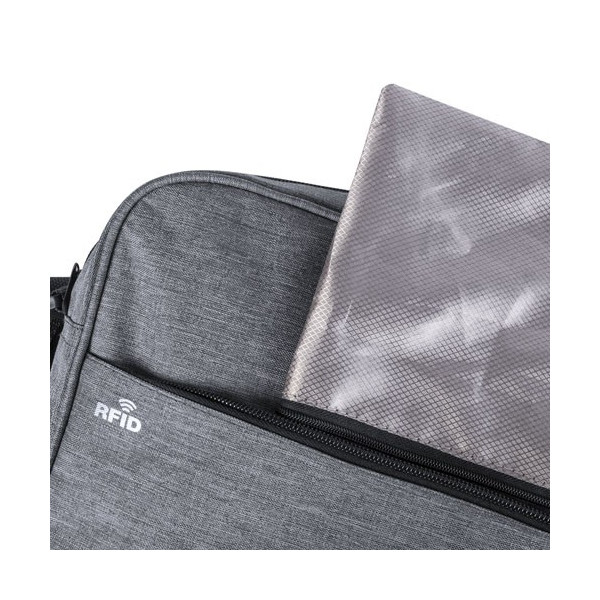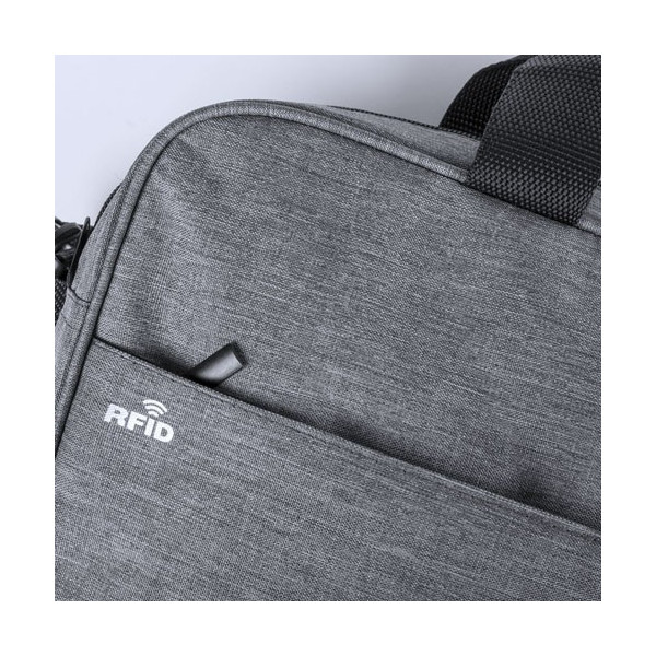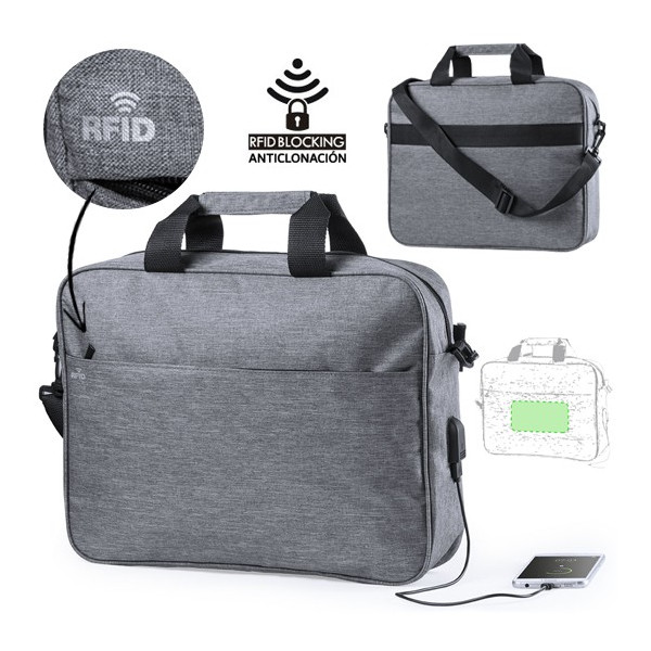 Portadocumentos de seguridad, con diseño urbano en resistente poliéster 300D. Bolsillo interior con protección de seguridad RFID (Identificación por Radio Frecuencia) que mantiene seguros los datos de la tarjeta y demás dispositivos. Asas con protección y compartimento principal con cierre de cremallera. Conexión USB -powerbank no incluido-, con bolsillos interiores acolchados para ordenador portátil de hasta 15 pulgadas y tablets de hasta 10 pulgadas. Cinta para hombro ajustable con protector acolchado.