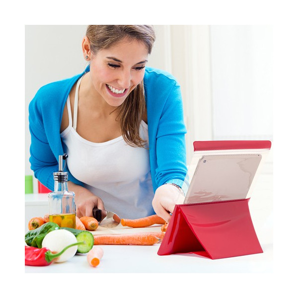 Prático portatodo impermeable en PVC en atrevido diseño bicolor, con función táctil y soporte integrado. Diseñado especialmente para tablets de hasta 9,7 pulgadas.