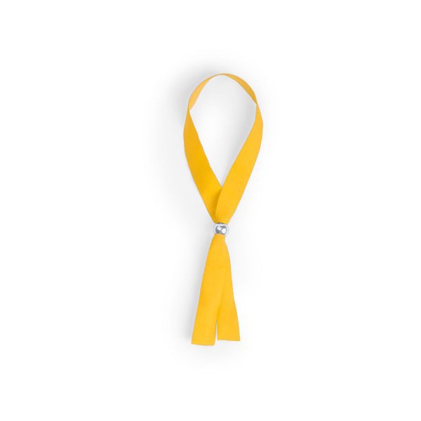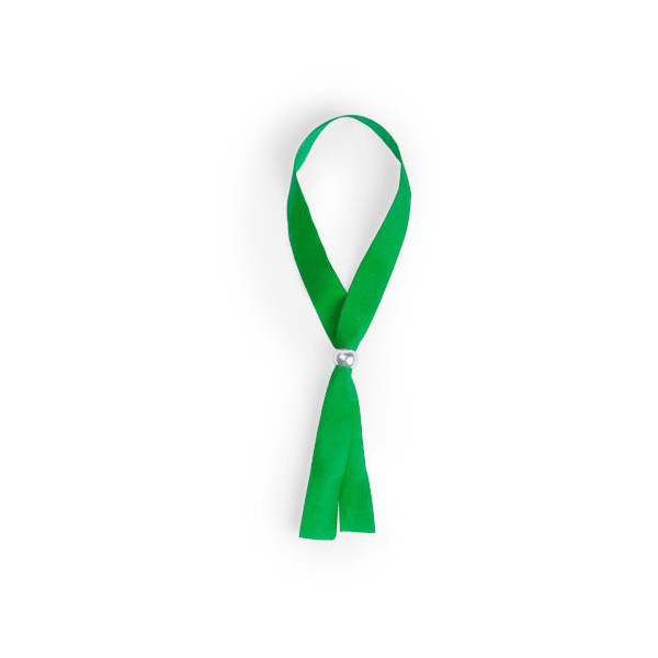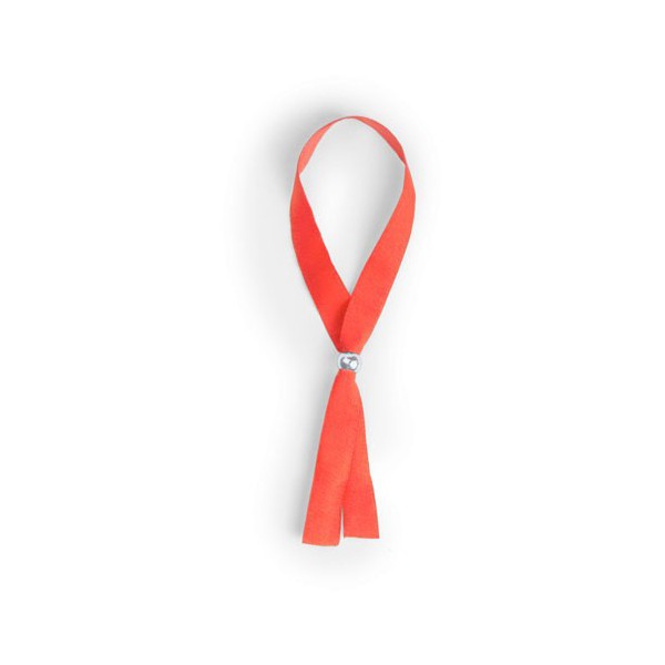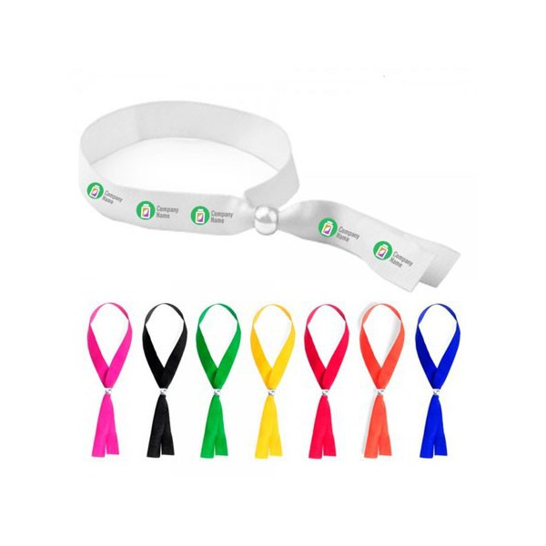 Pulsera ajustable en suave poliéster y variedad de colores. Con accesorio de ajuste en color plateado brillante.