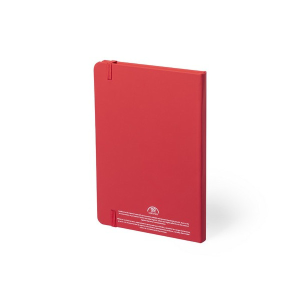 Bloc de notas tamaño A5 con tapas antibacterianas rígidas de polipiel.Disponible en variada gama de colores, con encuadernación cosida. Con banda elástica de cierre y marcapáginas a juego. Incluye 96 hojas de papel lisas en color crema, calidad 70g/m2. Los productos con tratamientos antibacterianos son capaces de reducir drásticamente las cargas bacterianas presentes en las superficies de los materiales, gracias a la incorporación de agentes microbianos permanentes estáticos, con alta efectividad para inhibir y prevenir la contaminación bacteriana. Artículo de acuerdo al estándar ISO 22196, que determina la actividad antibacteriana en materiales plásticos y superficies no porosas, lo que permite conocer la efectividad de inhibición microbiana que tienen los aditivos sobre los objetos tratados mediante una evaluación cuantitativa.