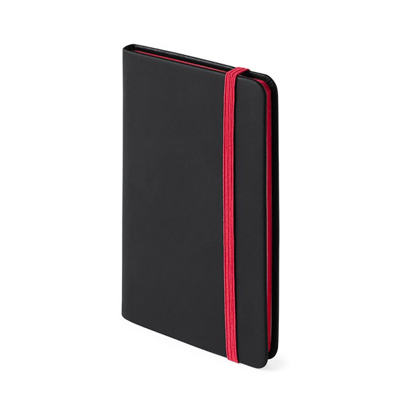 Bloc de notas con tapas de suave tacto acabadas en elegante polipiel negra. De 80 hojas lisas con lomo en divertidos colores, elástico de sujeción y marcapáginas de tela a juego.