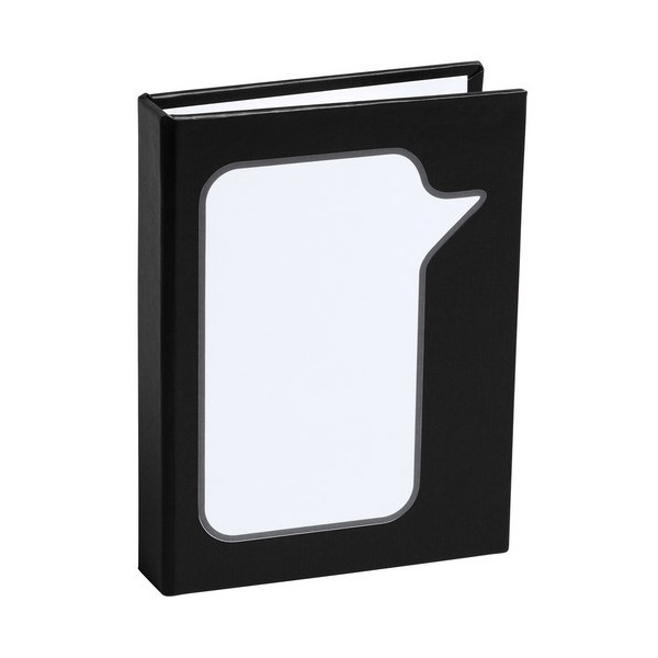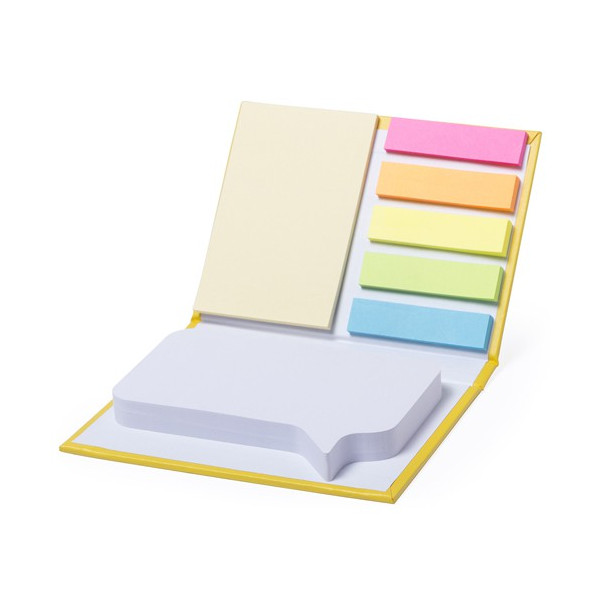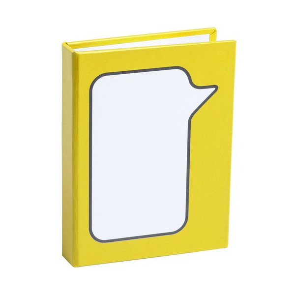 Original bloc de notas adhesivas con diseño de bocadillo y tapas de suave tacto acabadas en resistente cartón reciclado rígido de variados colores. Con 100 notas adhesivas grandes troqueladas en forma de bocadillo, 25 medianas y 125 mini notas adhesivas.
