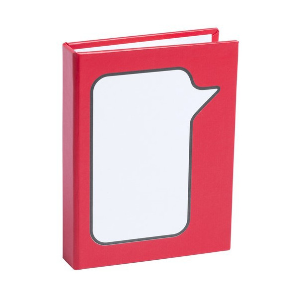 Block de notas adhesivas con diseño de bocadillo y tapas de cartón reciclado.