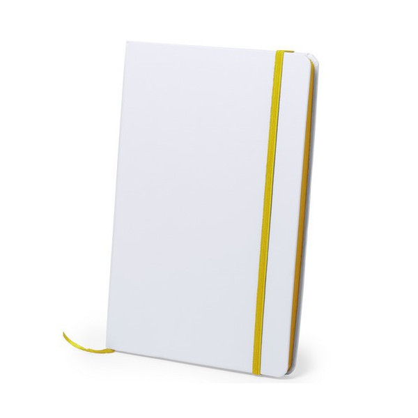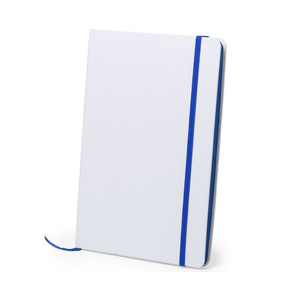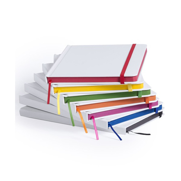 Block de notas con tapas en color blanco, con 100 hojas lisas, elástico y marcapáginas.