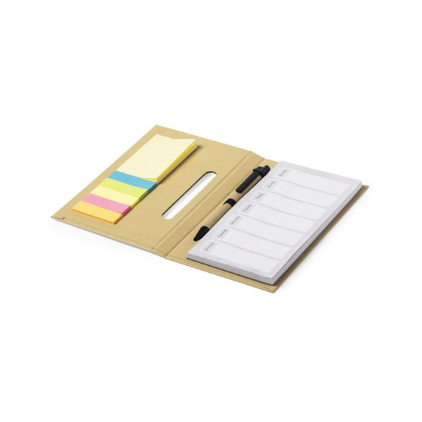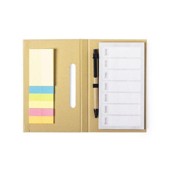 Set de bloc de notas y bolígrafo en línea nature con planificador semanal perpetuo. Tapas rígidas en cartón reciclado con soporte para bolígrafo y 60 hojas de planificación semanal. Incluye 25 notas adhesivas medianas y 125 mini-notas adhesivas. Con bolígrafo de mecanismo pulsador y cuerpo en cartón reciclado-tinta azul-.
