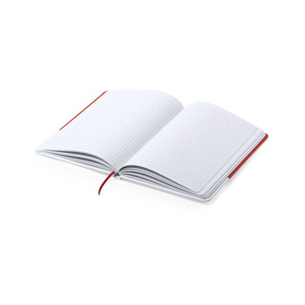 Block de notas bicolor, tapas eco-cuero y 100 hojas lineadas, marcapáginas y elástico.