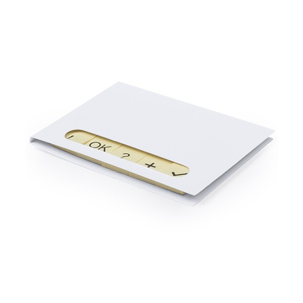 Bloc de notas adhesivas con tapa troquelada de suave tacto acabada en cartón de elegante color blanco. Con 125 mini notas adhesivas impresas con diferentes símbolos según uso.