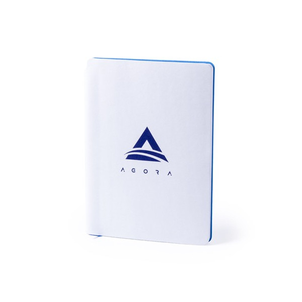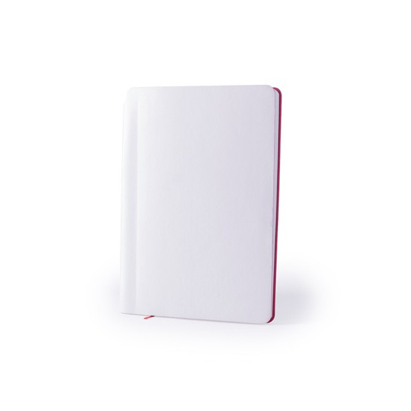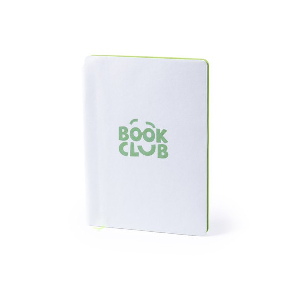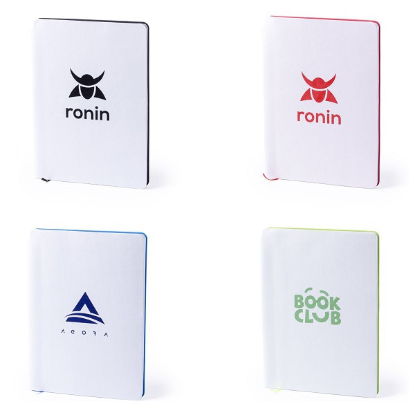 Bloc de notas de polipiel en desenfadada combinación de tapas de color blanco e interior en amplia gama de colores. Tapas especialmente diseñadas para marcaje en láser y con un recubrimiento exterior especial para que tu publicidad quede grabada en el mismo color que el del interior del bloc. De 80 hojas lisas, con marcapáginas de tela a juego.