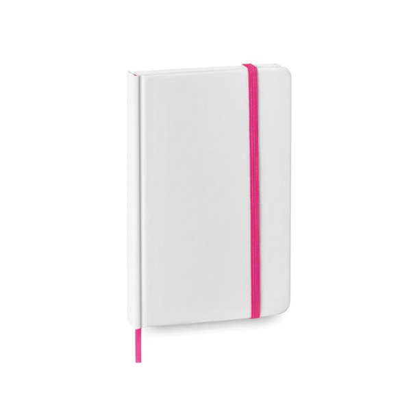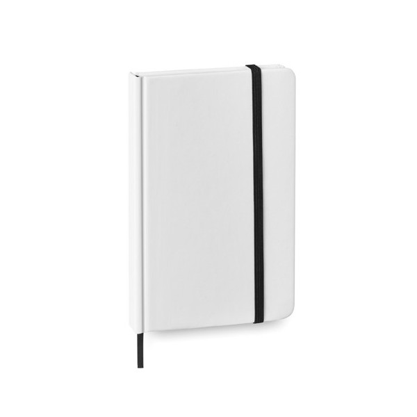 Block de notas con tapas en cartón blanco, con 80 hojas lisas, elástico y marcapáginas.