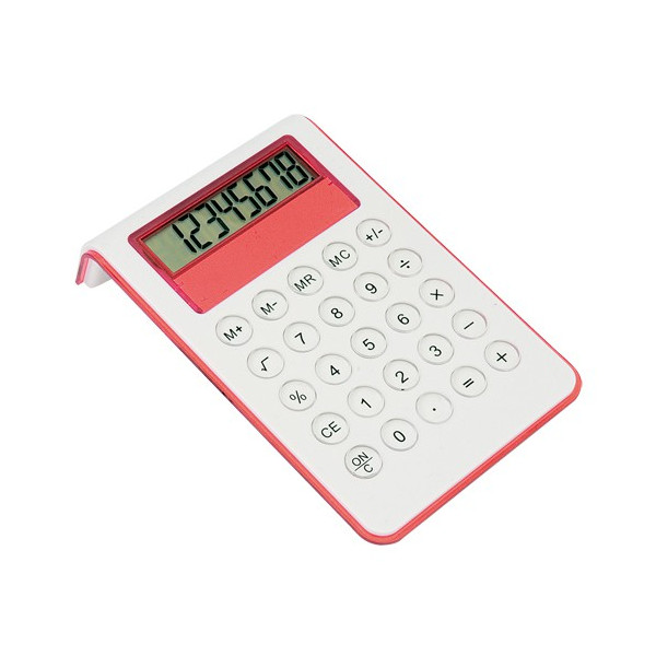 Calculadora de 8 dígitos en original diseño bicolor de vivos colores y con suaves teclas transparentes. Pila de botón incluida con film protector y presentada en caja individual.