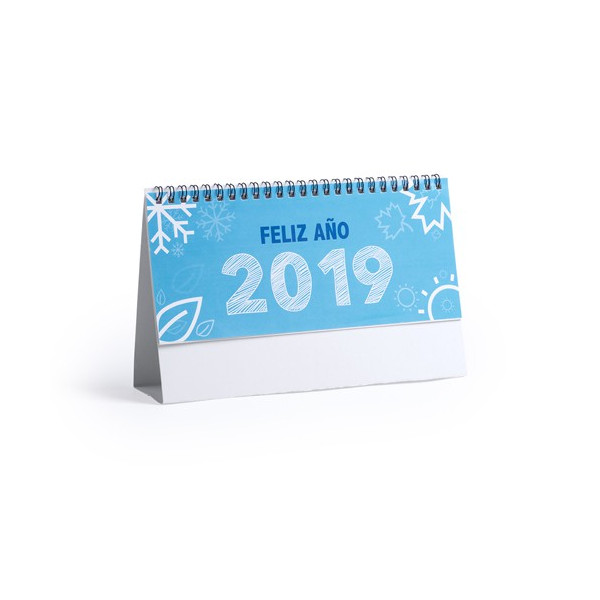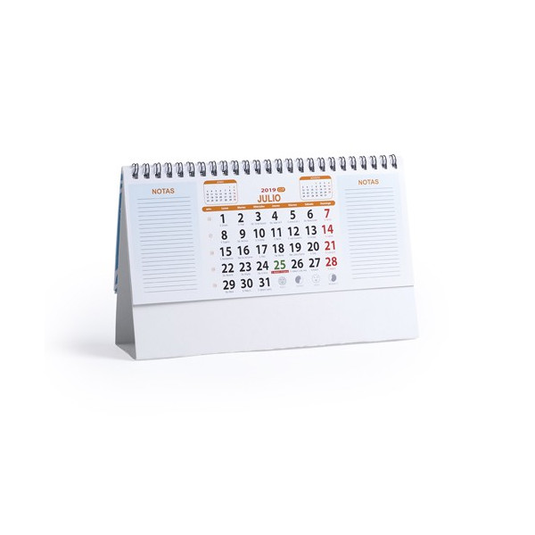 Calendario de sobremesa de anillas con cuerpo triangular en cartón. Diseño mes en curso/ mes anterior/ mes siguiente, santoral y espacio para notas. Amplia superficie de marcaje en ambas caras.