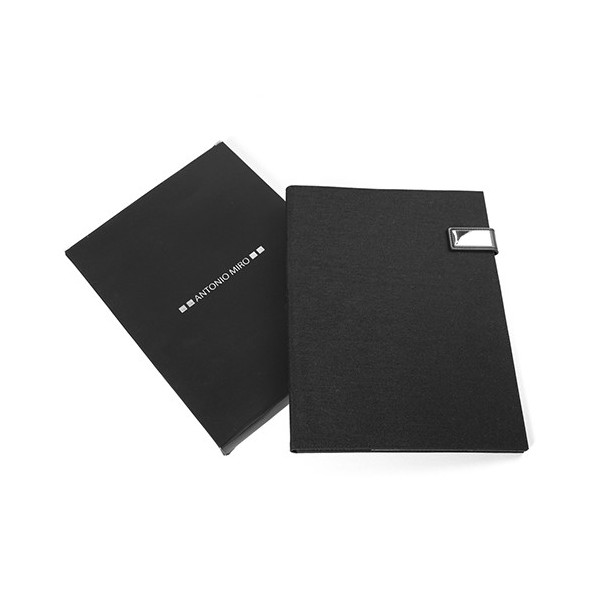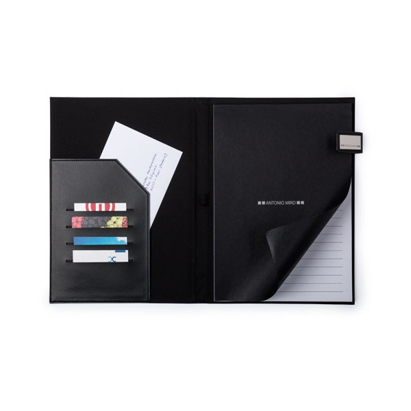 Carpeta de Antonio Miró en elegante combinación de nylon 1200D y suave polipiel. Con elegante cierre imantado con logotipo de la marca e interior con bolsillo de solapa, tarjeteros y bloc de notas de 50 hojas con distribución a una raya. Presentado en elegante caja negra con logotipo de la marca.