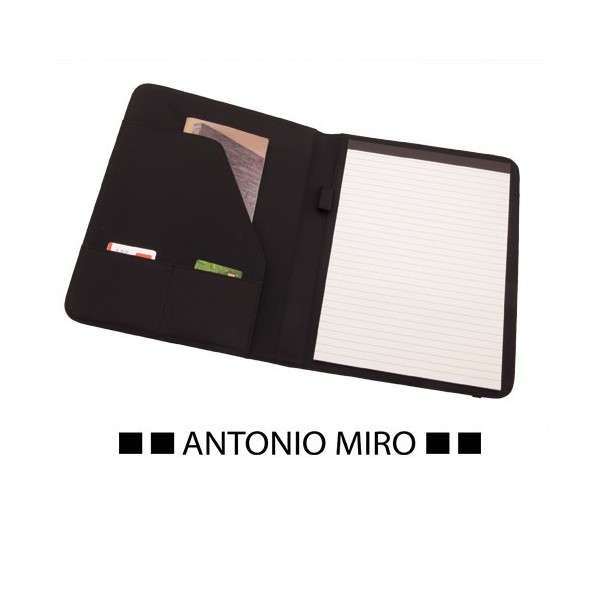 Carpeta de Antonio Miró en elegante combinación de microfibra y suave polipiel. Con original cierre elástico y chapa frontal con logotipo de la marca e interior con bolsillo de solapa, tarjeteros, soporte para bolígrafo y bloc de notas de 20 hojas con distribución a una raya. Presentado en elegante caja negra con logotipo de la marca.