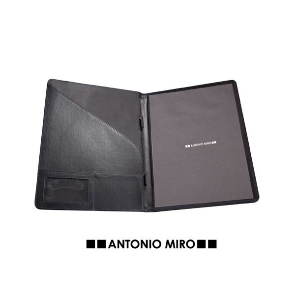 Carpeta de Antonio Miró en elegante y suave polipiel de acabado brillante. Interior con bolsillo de solapa, tarjeteros y bloc de notas de 20 hojas con distribución a una raya. Chapa frontal metálica con logotipo de la marca.