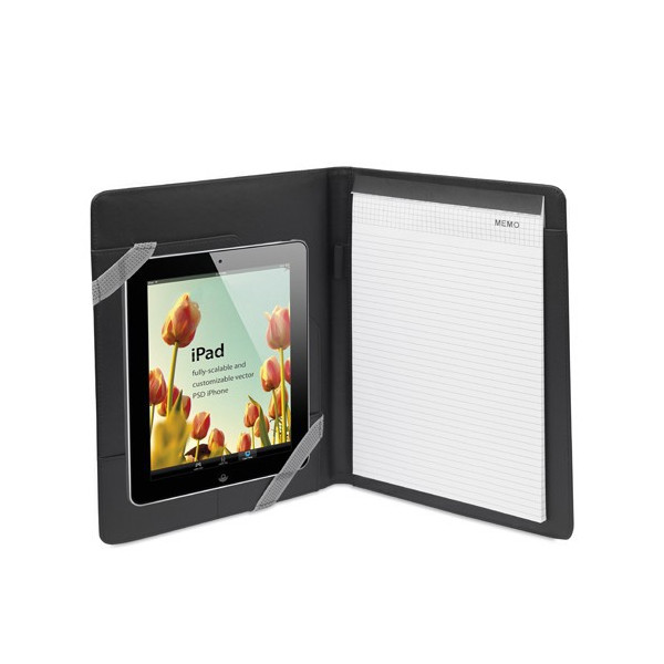 Elegante funda carpeta de acabado en suave polipiel acolchada para tablets de hasta 10 pulgadas. Con original banda rematada en placa metálica y cierre imantado. Interior con sujeción elástica para tablet, bloc de 20 hojas con distribución a una raya, bolsillo, tarjeteros y soporte para bolígrafo.