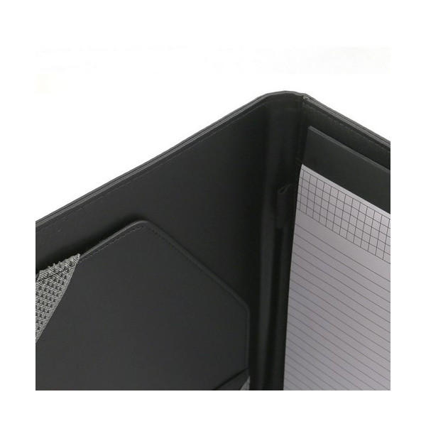 Elegante funda carpeta de acabado en suave polipiel acolchada para tablets de hasta 7 pulgadas. Con original banda rematada en placa metálica y cierre imantado. Interior con sujeción elástica para tablet, bloc de 20 hojas con distribución a una raya, bolsillo, tarjetero y soporte para bolígrafo.