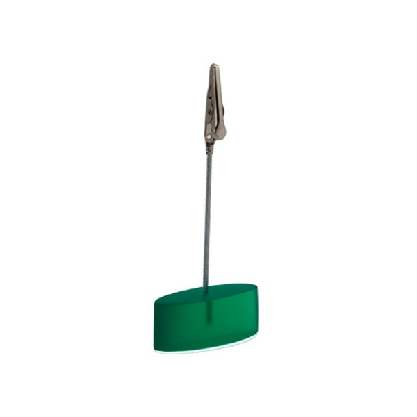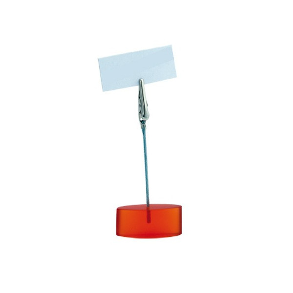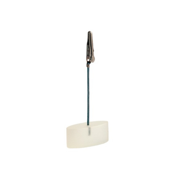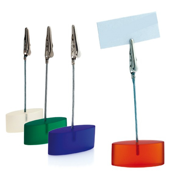 Clip de notas de escritorio con clip y cable de sujeción metálicos. Resistente base de resina en acabado translúcido en variados colores.