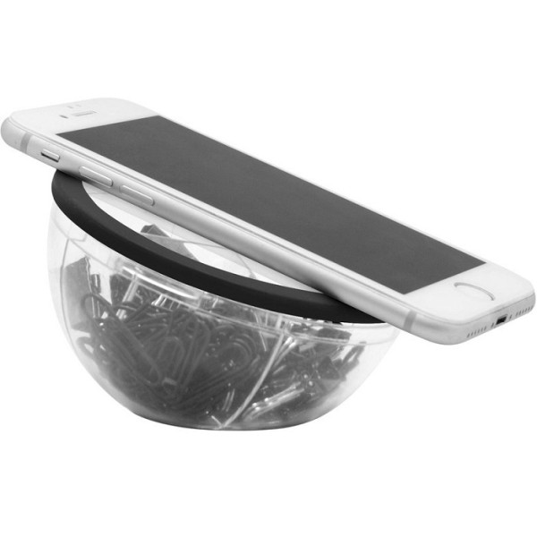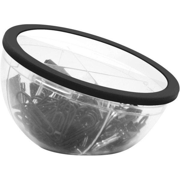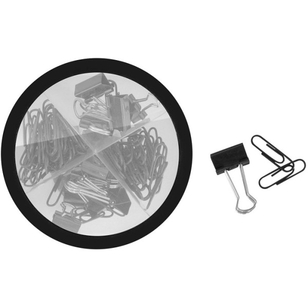 Plástico. Set con clips plásticos color negro y sujeta papeles. Caja plástica redonda, la apertura es giratoria y en el contorno es engomado para poder apoyar el celular.