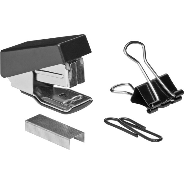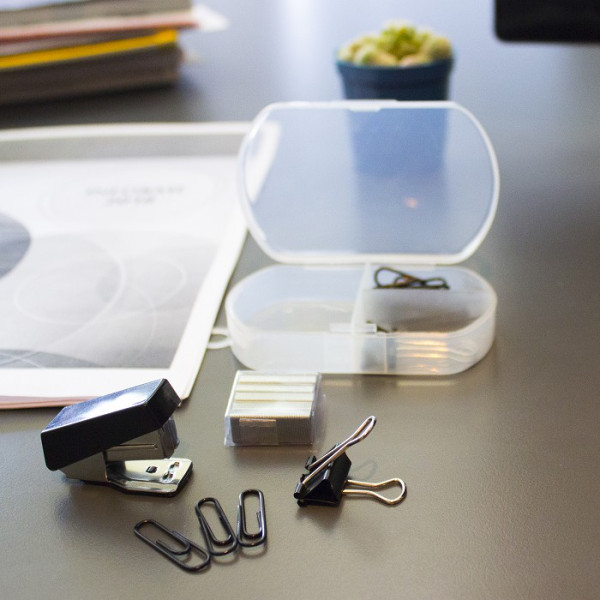 Plástico. Set de 1 corchetera. Repuestos de corchetes. Clips plásticos de color. 2 Sujeta papeles. Caja plástica transparente.