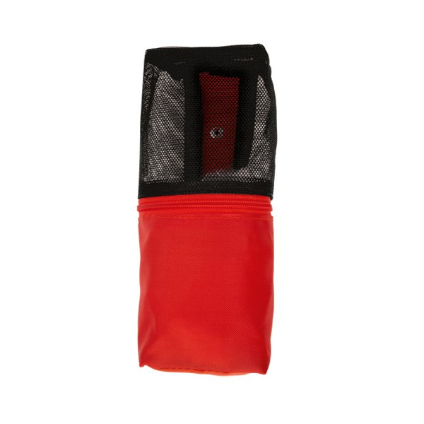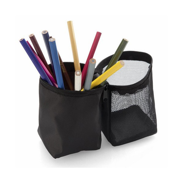 Estuche portalápices con cierre y diseño bicolor en poliéster y redecilla.