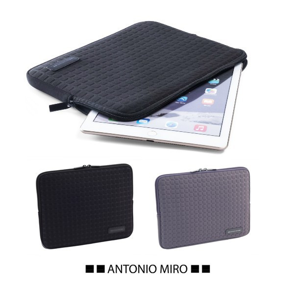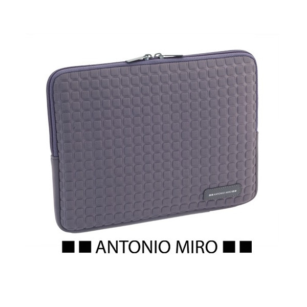 Funda de Antonio Miró en neopreno de elegante diseño para tablets de hasta 10 pulgadas. En sobrios colores, con cierre de cremallera de doble tirador y parche frontal en polipiel con logotipo de la marca.