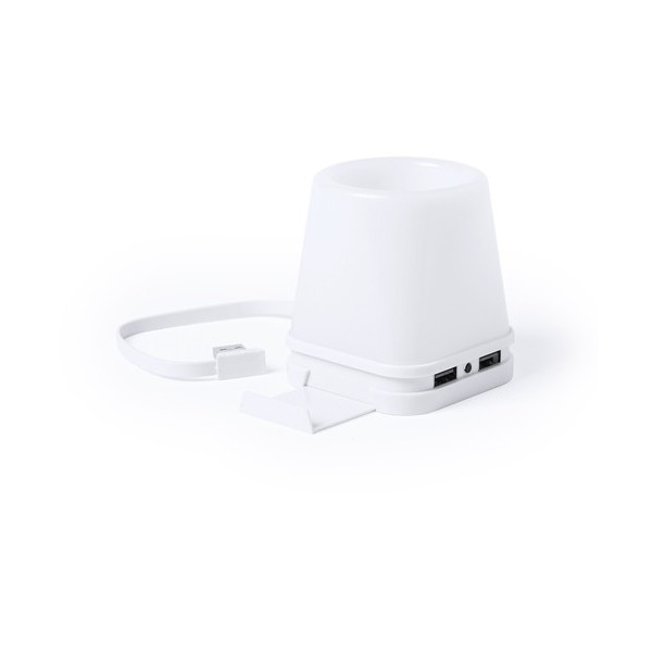 Original lapicero con puerto USB integrado. Retroiluminado por luz led, con 2 posiciones de iluminación y cuerpo en elegante color blanco para fácil marcaje. Incluye 4 puertos USB 2.0. Presentado en caja individual.