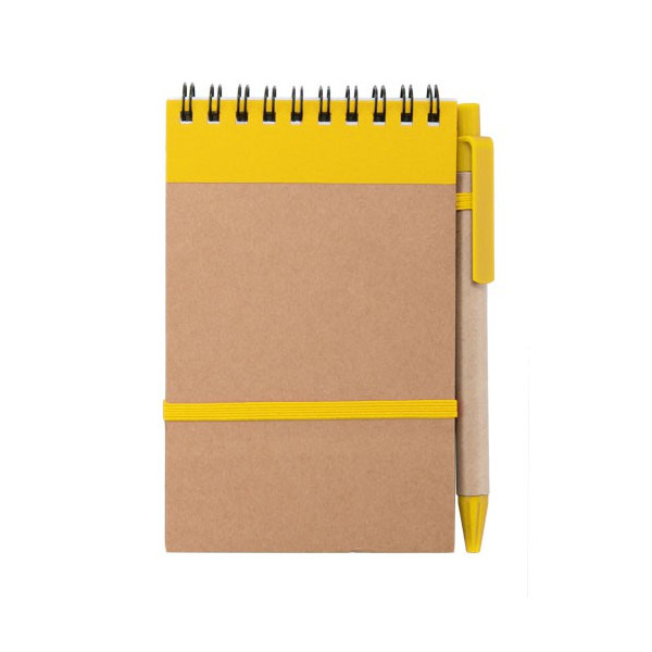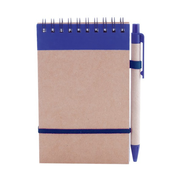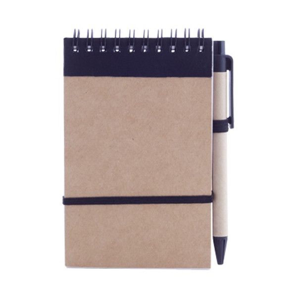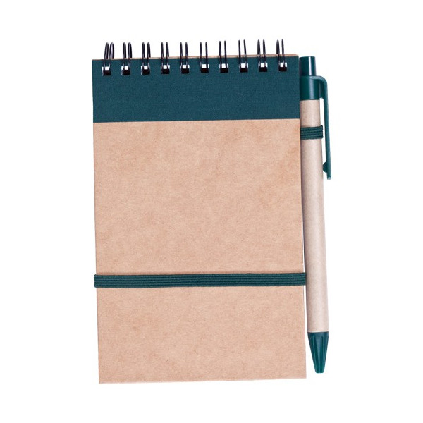 Libreta con espiral y tapas en cartón reciclado bicolor con elástico.