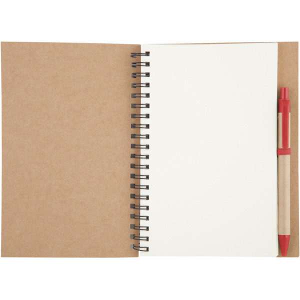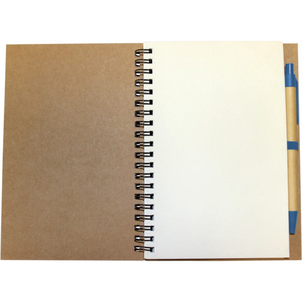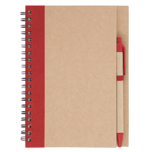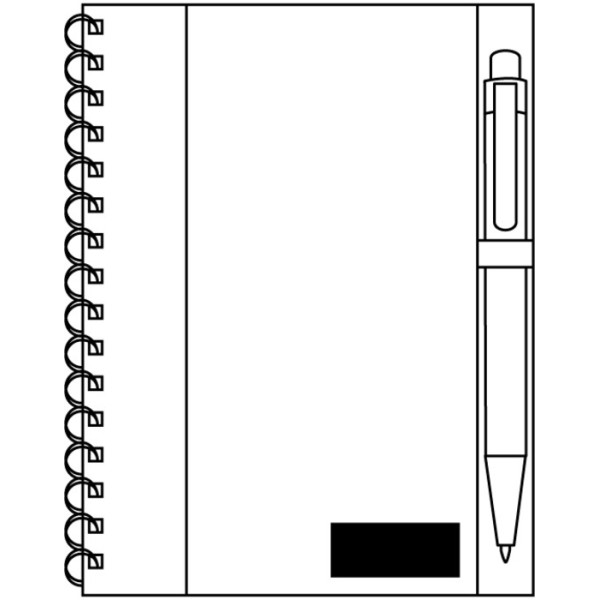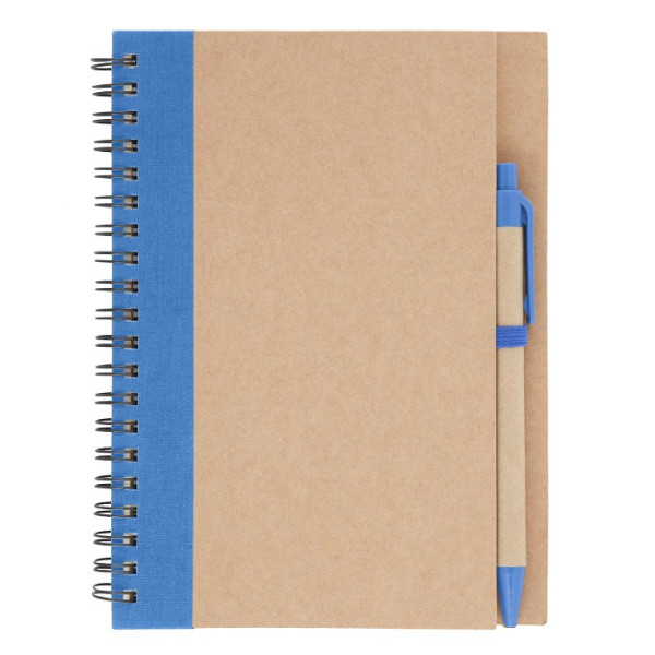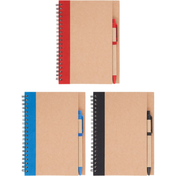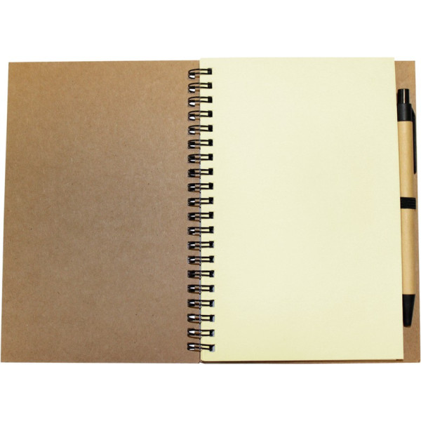 Elaborada con papel reciclado. Incluye bolígrafo biodegradable. Cierre con goma elástica. Posee 70 hojas de color amarillo en croquis (sin líneas).
