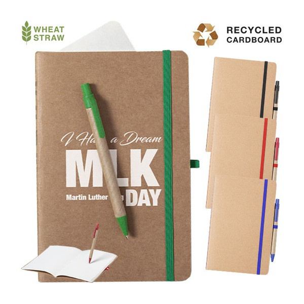 Set de libreta y bolígrafo de línea nature. Incluye libreta en cartón reciclado, con soporte para bolígrafo y cinta de cierre a juego, de 60 hojas lisas. Bolígrafo de mecanismo pulsador, con cuerpo en cartón reciclado y accesorios en caña de trigo -tinta azul-. Distintivo Wheat Straw en la parte superior del bolígrafo.