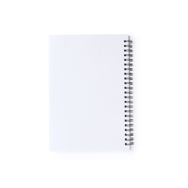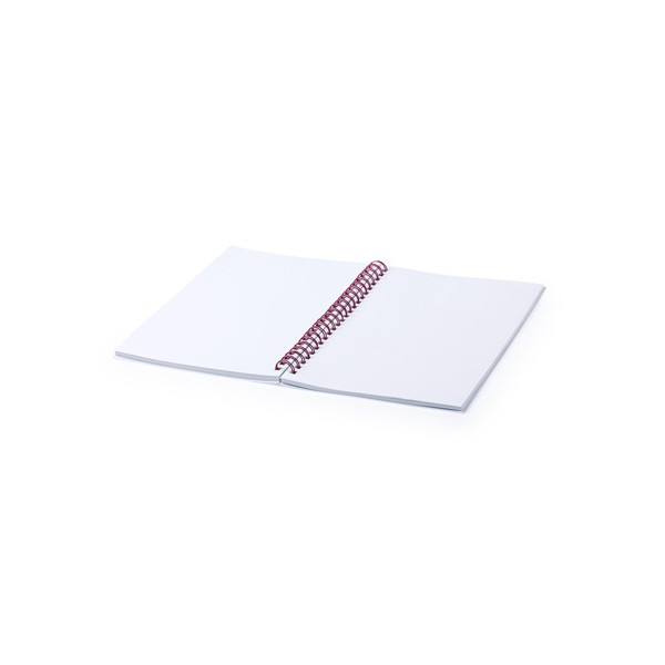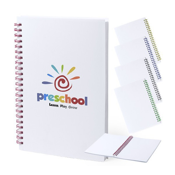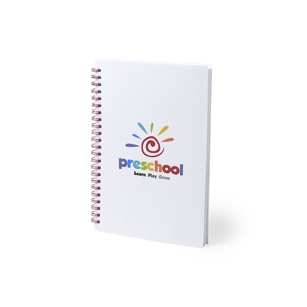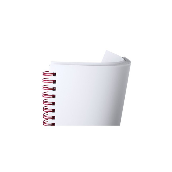 Resultona libreta con tapas flexibles en PVC blanco y anillas en variada gama de colores brillantes. Especialmente diseñada para impresión en tampografía. Incluye 80 hojas lisas.