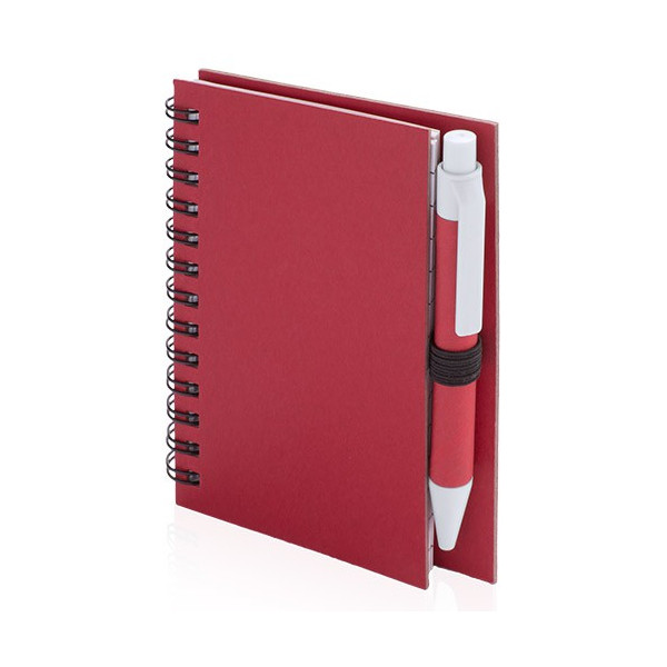 Libreta de anillas con tapas de suave tacto acabadas en resistente cartón reciclado y bolígrafo en cartón reciclado a juego. De atrevidos colores, 50 hojas con distribución a una raya y con soporte para bolígrafo en contraportada.