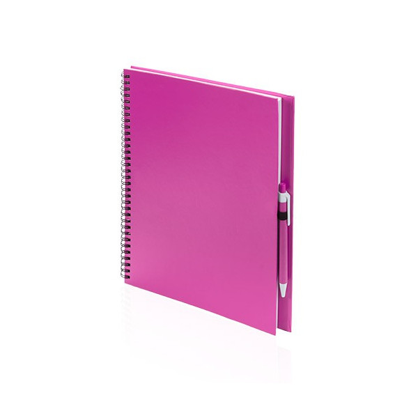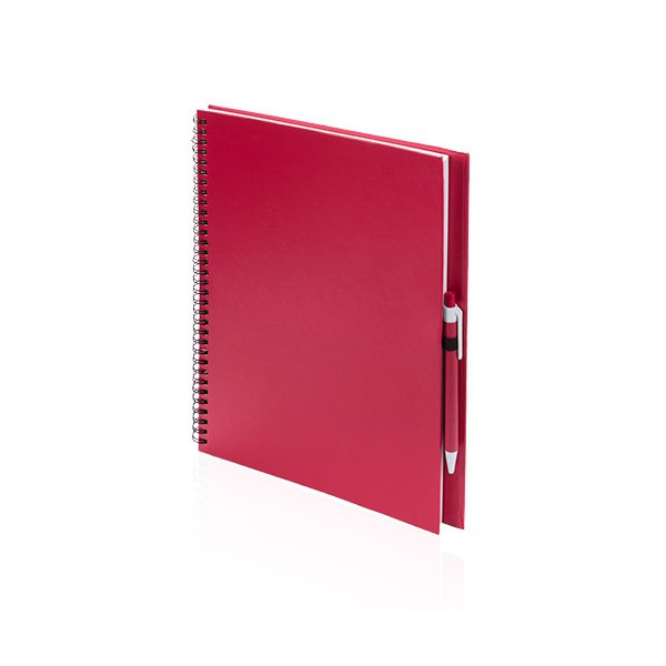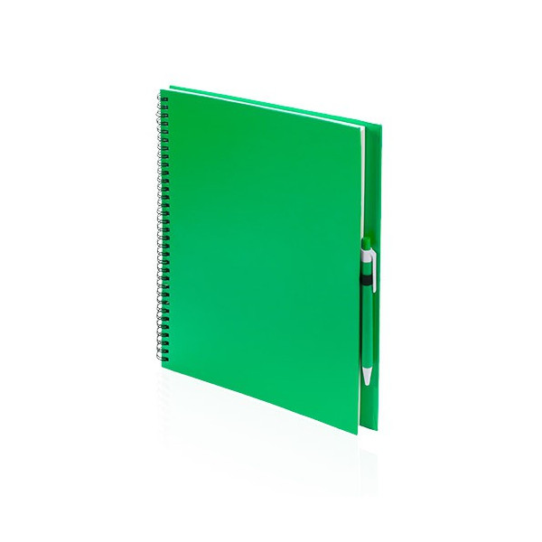 Libreta de anillas con tapas de suave tacto acabadas en resistente cartón reciclado y bolígrafo en cartón reciclado a juego. De atrevidos colores, 80 hojas lisas y con soporte para bolígrafo en contraportada.