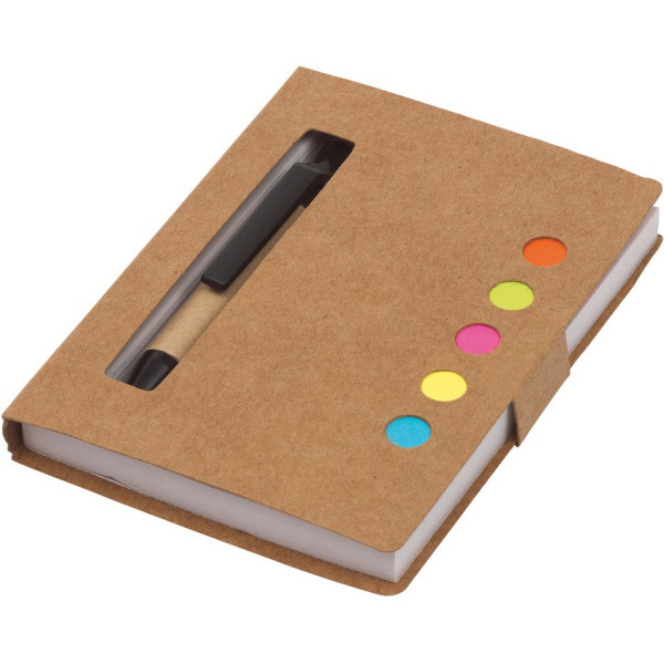 Cartón. Material reciclado. 80 hojas lisas blancas. 5 blocks autoadhesivos rectangulares de diferentes colores. 1 bolígrafo de tinta negra.