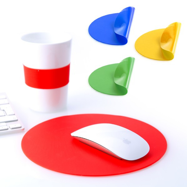 Alfombrilla de silicona de alta calidad, de diseño circular con cuerpo en vivos colores y base antideslizante. Presentada en atractiva bolsa de diseño con refuerzo de cartón.