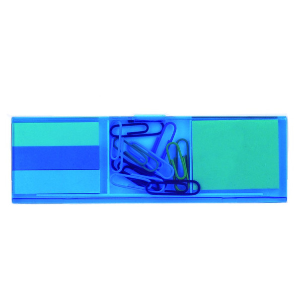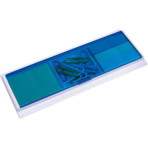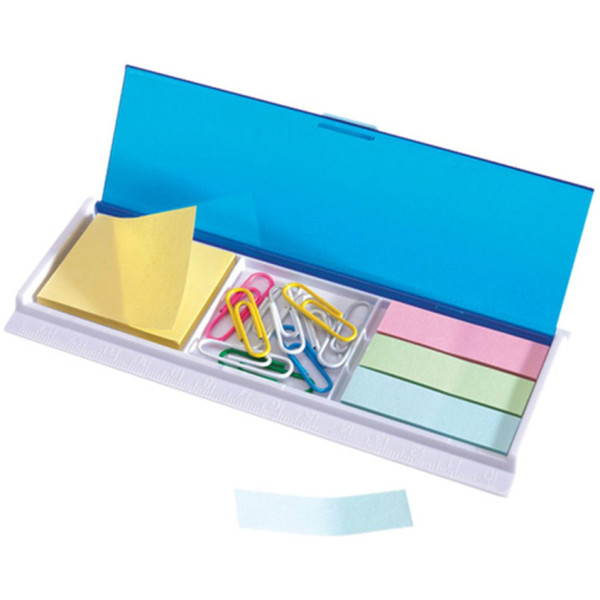 Plástico. 4 Blocks autoadhesivos de diferentes colores. Compartimento para clips. Clips de diferentes colores. Caja contenedora con regla incluida. Tapa traslúcida.