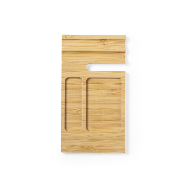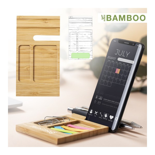 Organizador de línea nature con función soporte para smartphone, soporte para bolígrafos, clips y notas adhesivas (accesorios no incluidos). Fabricado en bambú procedente de cortes naturales, con amplia superficie de marcaje y presentado en atractiva caja de diseño eco.