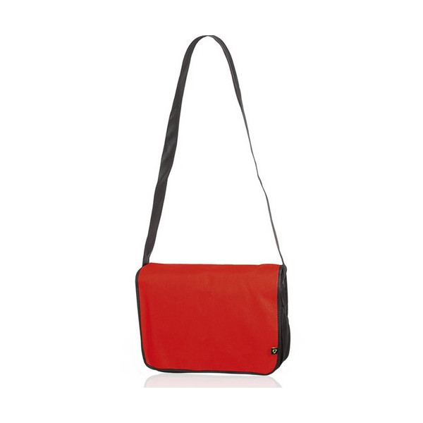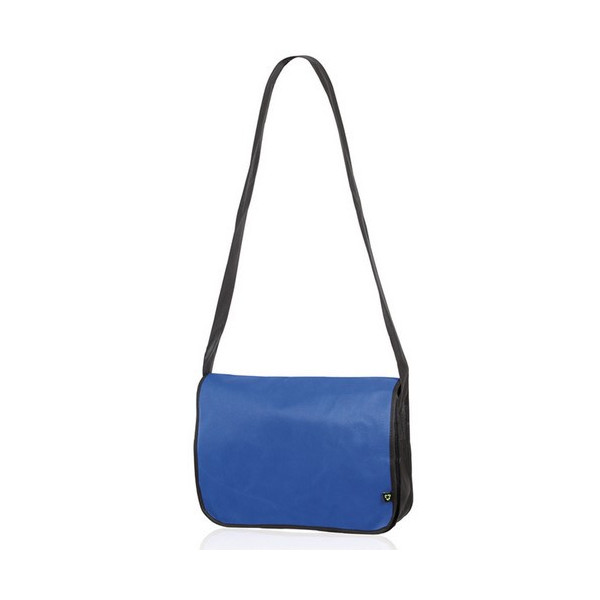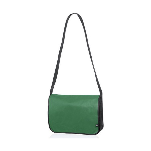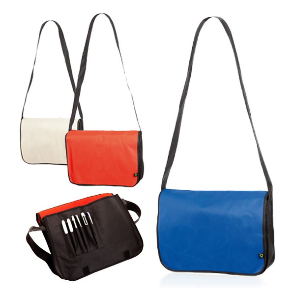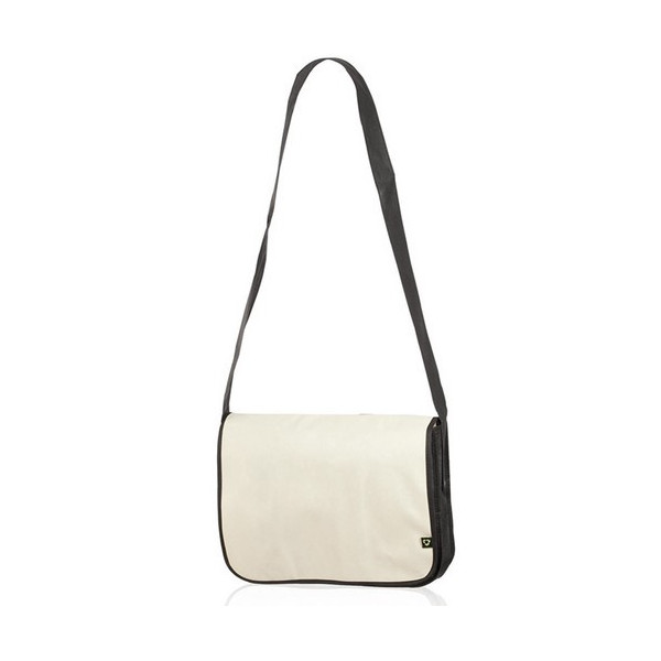 Portadocumentos con solapa de cierre de velcro en resistente non-woven con elegante ribete en color negro. Con cinta bandolera ajustable y compartimentos interiores para bolígrafos.