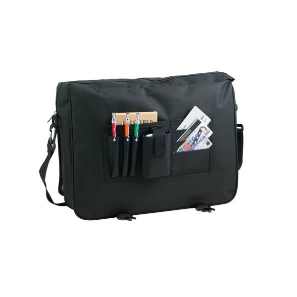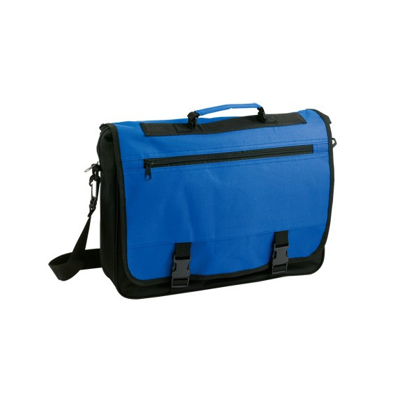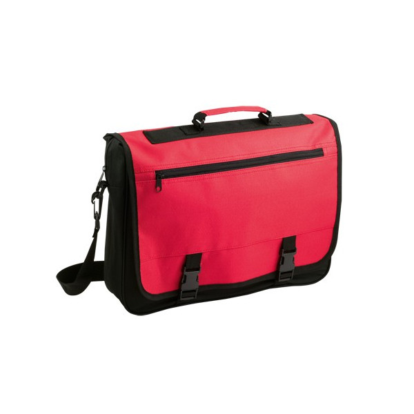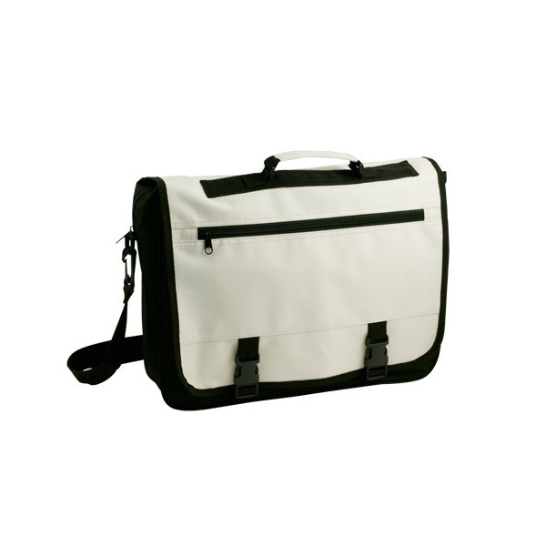 Portadocumentos con solapa de cierre de velcro en poliéster 600D con elegante tira frontal en color negro. Con asas de transporte reforzadas y cinta bandolera ajustable. Compartimentos interiores para bolígrafos y funda para smartphone en PVC con función táctil.