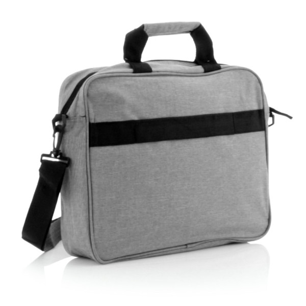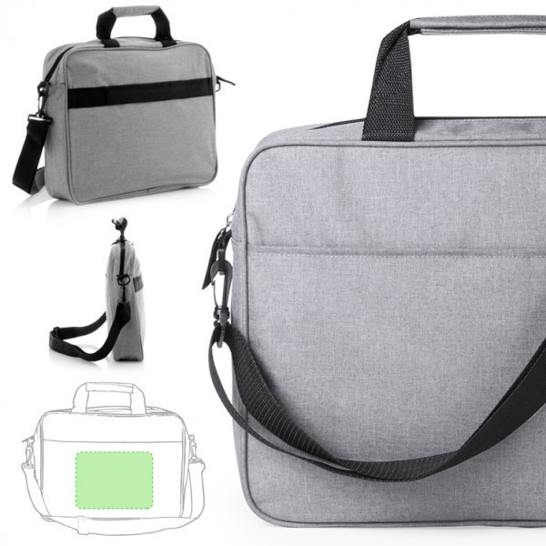 Portadocumentos de cierre de cremallera en elegante poliéster 600D de color gris. Con bolsillo exterior con cierre de velcro, cómodas asas reforzadas, cinta bandolera ajustable con cierre de mosquetón y accesorio en parte trasera para acople en barra de trolley.