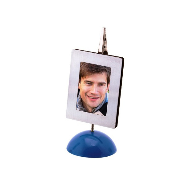 Portafotos de escritorio con clip portanotas metálico, marco imantado en acero inox y resistente base antideslizante en variados colores. Presentado en caja de PVC