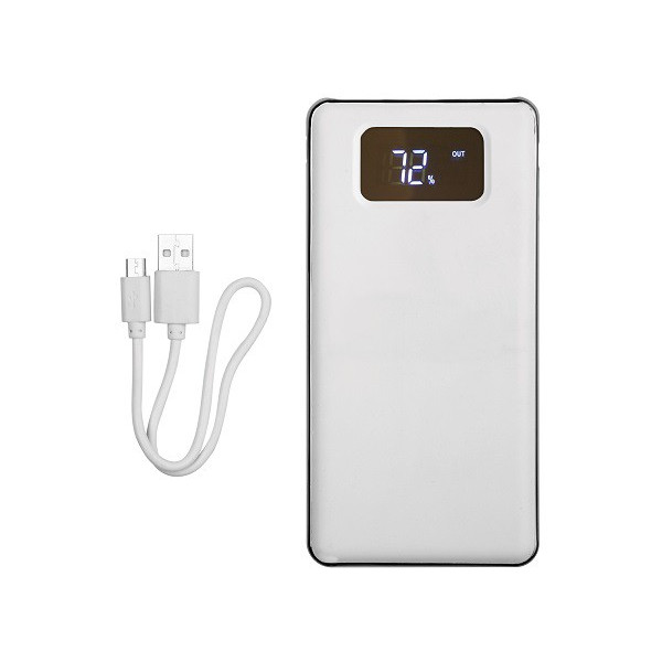 Capacidad 8000 MAH Plástico. Batería portátil para celular y diferentes dispositivos que contengan el mismo puerto de entrada. Dos puertos USB que permite conectar dos dispositivos simultánamente. Pantalla digital que indica el porcentaje de carga. Presionando dos veces el boton de encendido se encienda la linterna. Con certificación de calidad.
