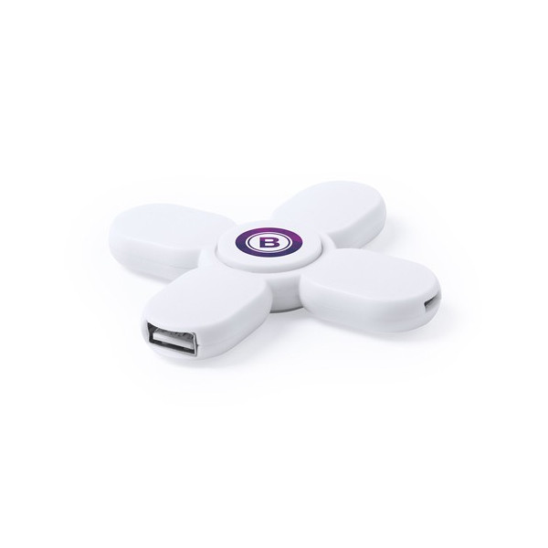 Original puerto USB con spinner antiestrés acabado en color blanco. Incluye 3 puertos USB 2.0 y pastilla central especialmente diseñada para marcaje en tampografía.